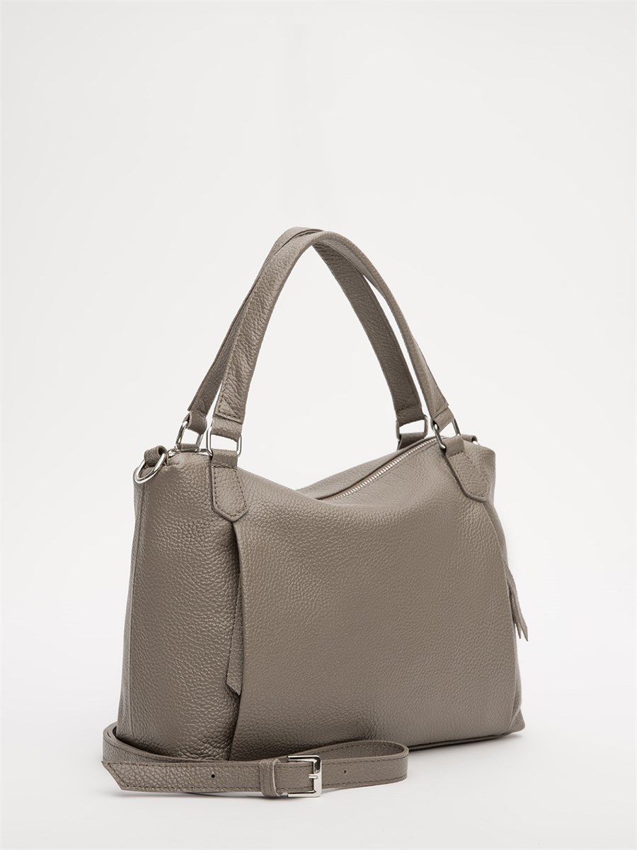 Элегантная женская сумка-тоут среднего размера из натуральной кожи с двумя удобными ручками для комфортного ношения. Регулируемый ремень с пряжкой позволяет менять длину и носить её на плече или в руках. Внутри просторное основное отделение со стандартными карманами и дополнительный накладной карман на молнии для мелочей. На передней части сумки стильное тиснение по низу, придающее модели изысканный акцент. Идеальный выбор для повседневного образа, сочетающий практичность и классический дизайн.