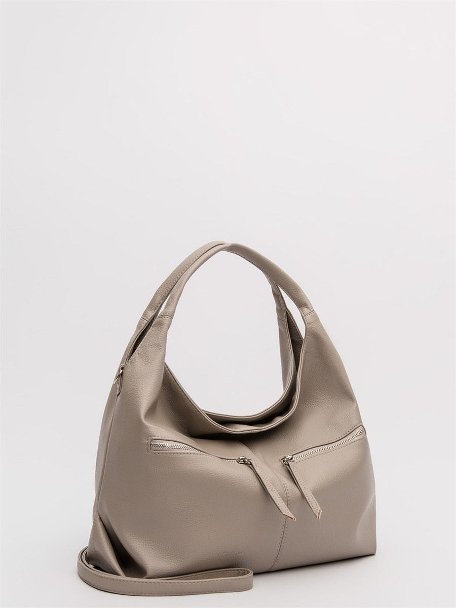 Мягкая форма с разрезной передней частью и двумя карманами на металлической молнии (с кожаными наконечниками бегунков) выглядит объемной, но сохраняет аккуратность. Ручки, плавно переходящие в корпус, создают цельный гармоничный силуэт.