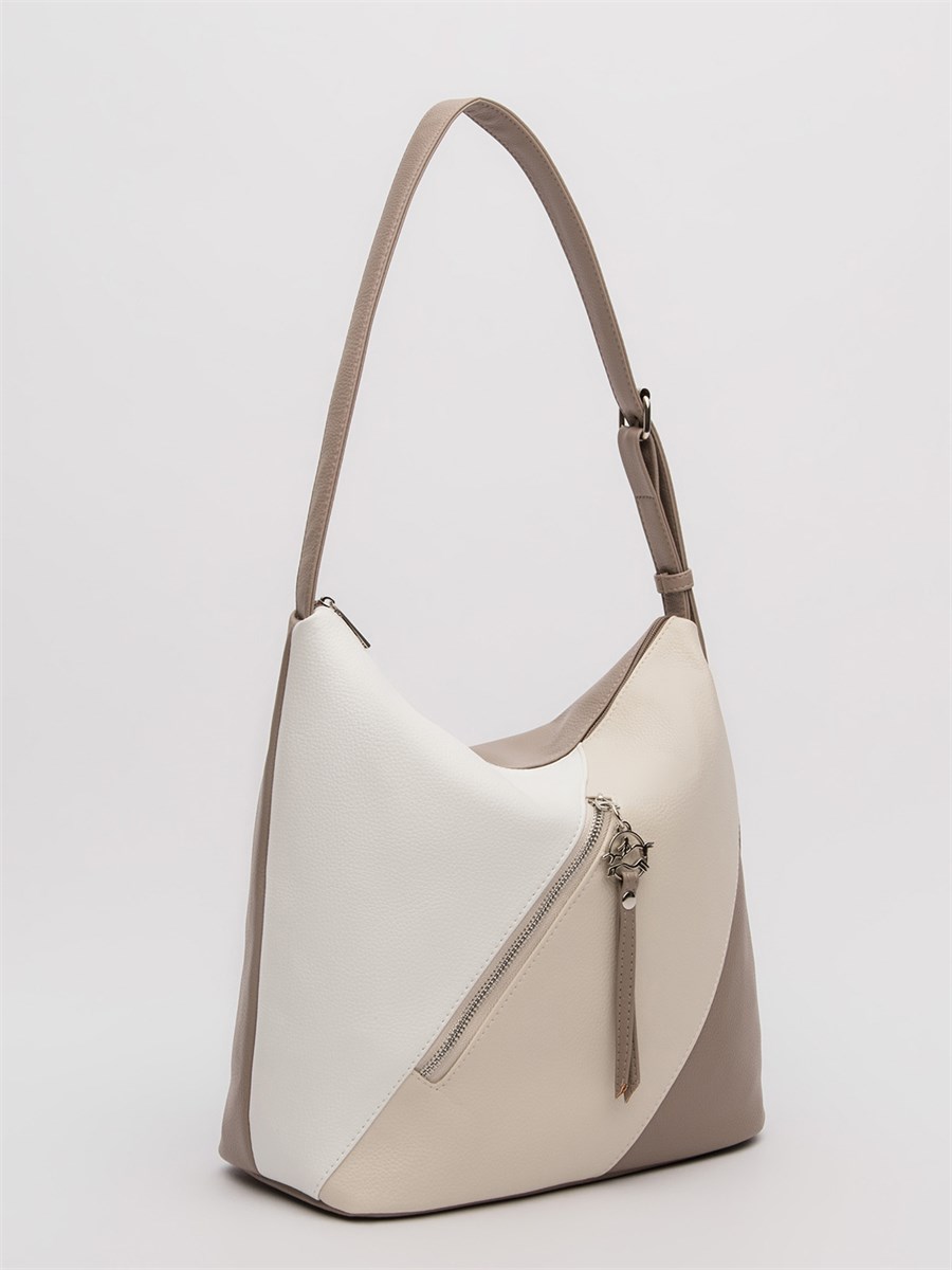 Диагональные резы на передней детали добавляют динамики объёмному силуэту, создавая эффектный контраст. Доступна в лаконичном однотонном и выразительном трёхцветном вариантах — для сдержанных или ярких луков. Регулируемый ремень на пряжке позволяет носить сумку тремя способами: на плече, в руке или как кросс-боди.