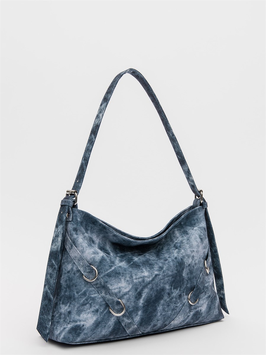 Элегантная форма хобо с декоративными ремнями и металлической фурнитурой представлена тёмно-синем оттенке. Сочетание винилискожи с отделкой под деним и эффектом тай-дай делает модель стильным акцентом в любом образе.
