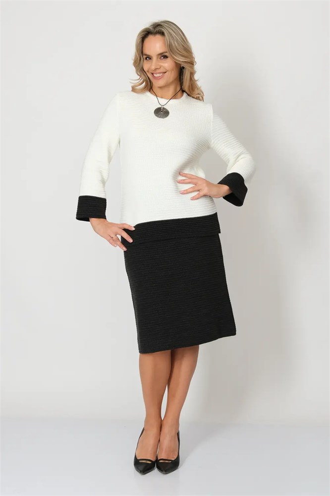 Костюм состоит из джемпера и юбки. Джемпер свободного силуэта с круглой горловиной. Рукава втачные длинные расклешенные к низу. По низу изделия и рукавов отделка контрастного цвета.