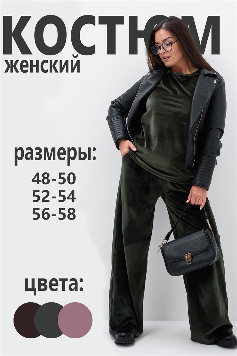 Костюм женский двойка штаны + кофта выполнен из плотной и мягкой ткани велюр. Брюки с карманами и поясом на резинке, у кофты округлый воротник и рукав 3/4 на манжете. Комплект прямого свободного силуэта, Идеального подходит для повседневной носки.