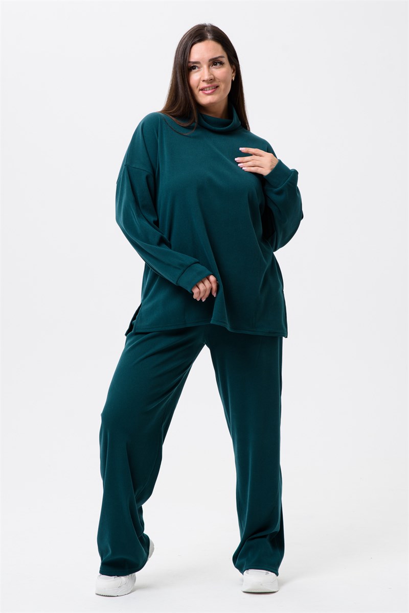 Женский костюм - двойка, выполнен из утепленной, мягкой, рельефной ткани. Верх - кофта, достаточно свободного кроя, рукав спущенный на манжете, горловина высокая, также можно носить раздельно от штанов, хорошо будет сочетаться с джинсами или с классическими брюками. Низ - свободные штаны палаццо, пояс на резинке, по бокам карманы. Костюм прекрасно подойдет для прогулок и работы, хорошо в прохладную погоду с жилеткой или пальто, идеально для вашего гардероба.