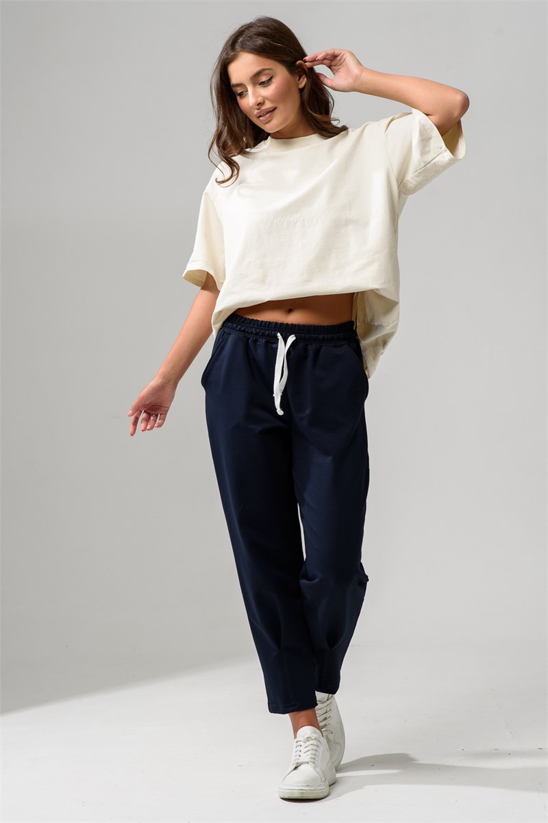 Базовые брюки-бананы это идеальный выбор для повседневного стиля. Укороченные 7/8 на подойдут как для прогулок, спорта и офиса. Брюки на резинке из высококачественного хлопкового материала имеют эластичный пояс завязками и карманы. На высокой посадке, визуально удлиняет ноги и подчеркивают женственный силуэт.