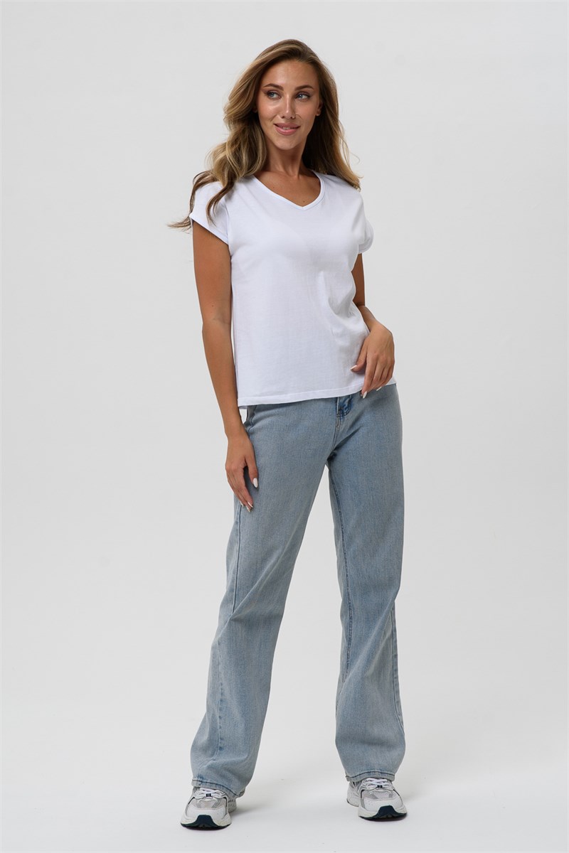 Футболка полуприлегающего силуэта, средней длины, с V-образной горловиной. Рукав цельнокроеный, короткий. Горловина и пройма обработаны бейкой из основного полотна.