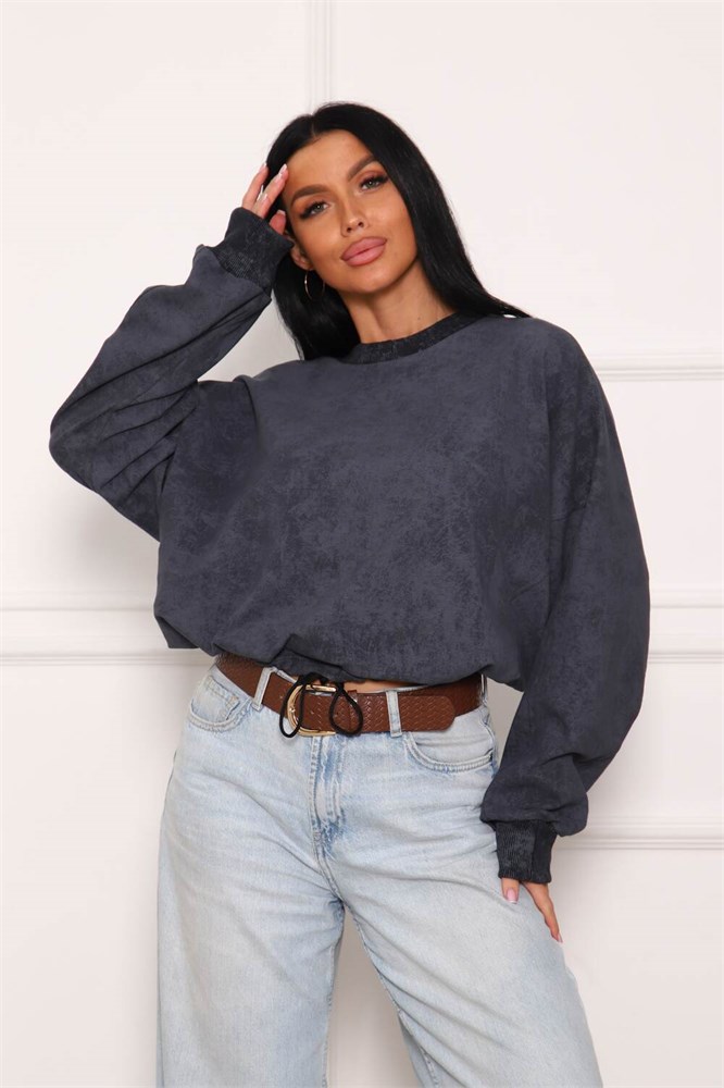 Свитшот женский сложного кроя, из трикотажного полотна с напылением, которое создает эффект стиля винтаж. Свитшот свободного облегания, рукав летучая мышь, на манжете. Горловина круглой формы, обработана обтачкой. Низ изделия на регулируемой кулисе со шнуром. Манжеты и обтачка горловины выполнены из кашкорсе в цвет основной ткани.