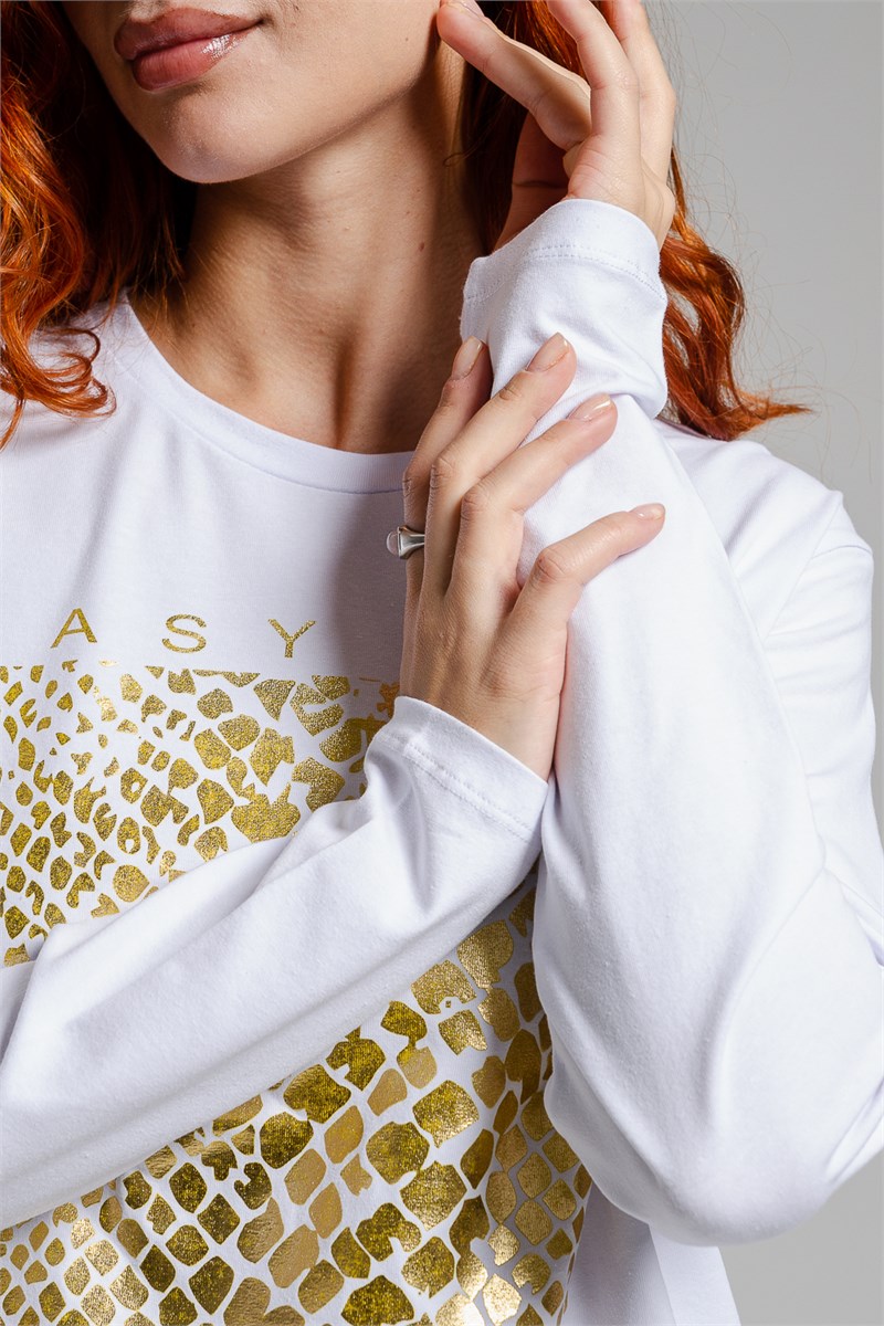 Лонгслив снова в моде и прочно обосновался в базовом гардеробе современного человека. Удобная трикотажная кофта представляет собой футболку с длинным рукавом, которую можно использовать как самостоятельный элемент, так и носить под пиджак, толстовку или рубашку. Лонгслив выполнен из высокоплотного хлопкового трикотажа и является невероятно комфортным и удобным. Футболка с длинными рукавами имеет прямой базовый крой и классическую линию плеча. Лонгслив - это неформальный стиль, когда на футболку можно надеть клетчатую рубашку и сочетать с кедами и джинсами. За счет натуральной ткани лонгслив можно носить в качестве домашней одежды или нательного белья, одежды для сна, тренировочной спортивной одежды и военной экипировки. Если вы хотите силуэт оверсайз нужно взять на размер или два больше, ориентируйтесь по таблице замеров. Принт фольга - очень яркий и блестящий.