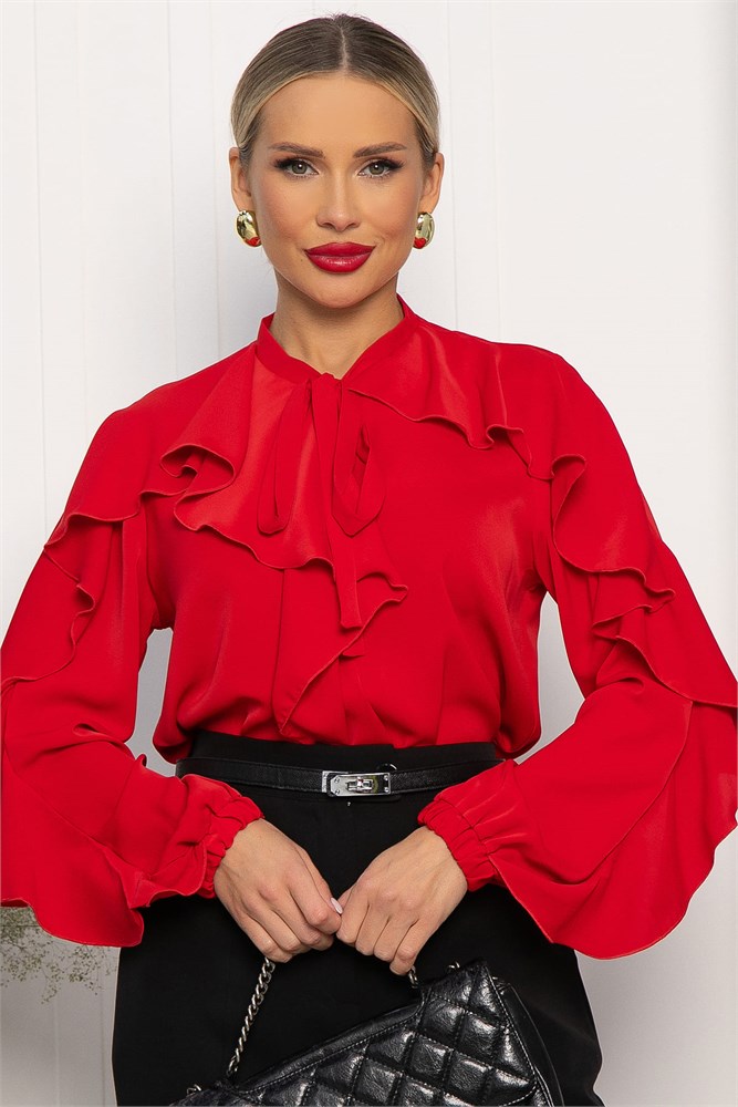 Встречайте новый must-have в гардеробе — элегантную блузку, созданную для тех, кто ищет комфорт и безупречный стиль каждый день. Длинные рукава заканчиваются резинкой, а V-образный вырез добавляет образу утонченности. Воланы по рукавам и переду придают модели романтичности и изящества. Сочетайте блузку с джинсами, брюками или юбкой-карандаш, чтобы создать деловой образ для офиса или наряд для особого случая.