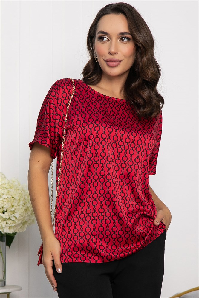 Блуза в красном цвете с принтом станет отличным дополнением в вашем гардеробе! Её легко сочетать с брюками, джинсами или юбкой. Также можно надеть под пиджак или жакет. Модель свободного кроя с цельнокроеным рукавом и округлым вырезом. Она подходит для повседневных образов и для домашнего использования. Благодаря своему свободному крою она обеспечит комфорт и свободу движения. Длина переда короче.