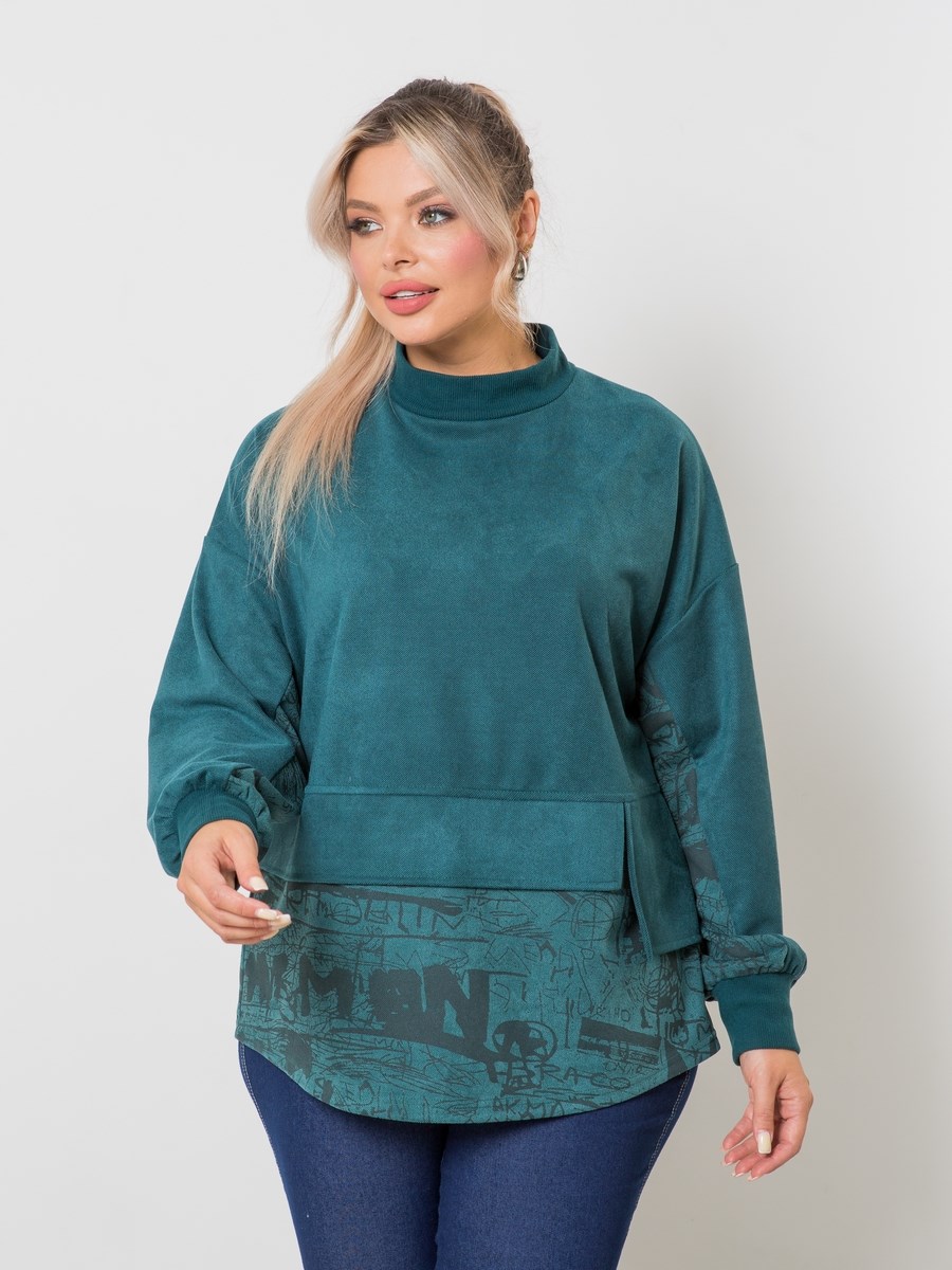Удобная повседневная блузка свободного силуэта выполнена из плотной эластичной ткани в рубчик. Блузка с отрезной нижней частью по переду и спинке. Верхняя часть переда и спинки целая. По шву притачивания верхней и нижней частей блузки отлетные разно-уровневые отделочные детали. Горловина переда и спинки с втачным воротником стойкой. Блузка с удлиненной линией плеча и свободной заниженной проймой. Рукав со вставкой, втачной длинный с притачными манжетами по низу. Длина рукава от горловины в 50 р-ре – 69 см. в 64 р-ре – 75 см. Ширина рукава по низу в 50 р-ре – 20 см. в 64 р-ре – 22 см. Вставки рукава и нижняя часть блузки выполнена из ткани отделочного цвета. Воротник стойка и манжеты выполнены из ткани рибана. Блузка без подклада и застежек. Длина изделия по спинке в 50 р-ре – 65 см. в 64 р-ре – 74 см.