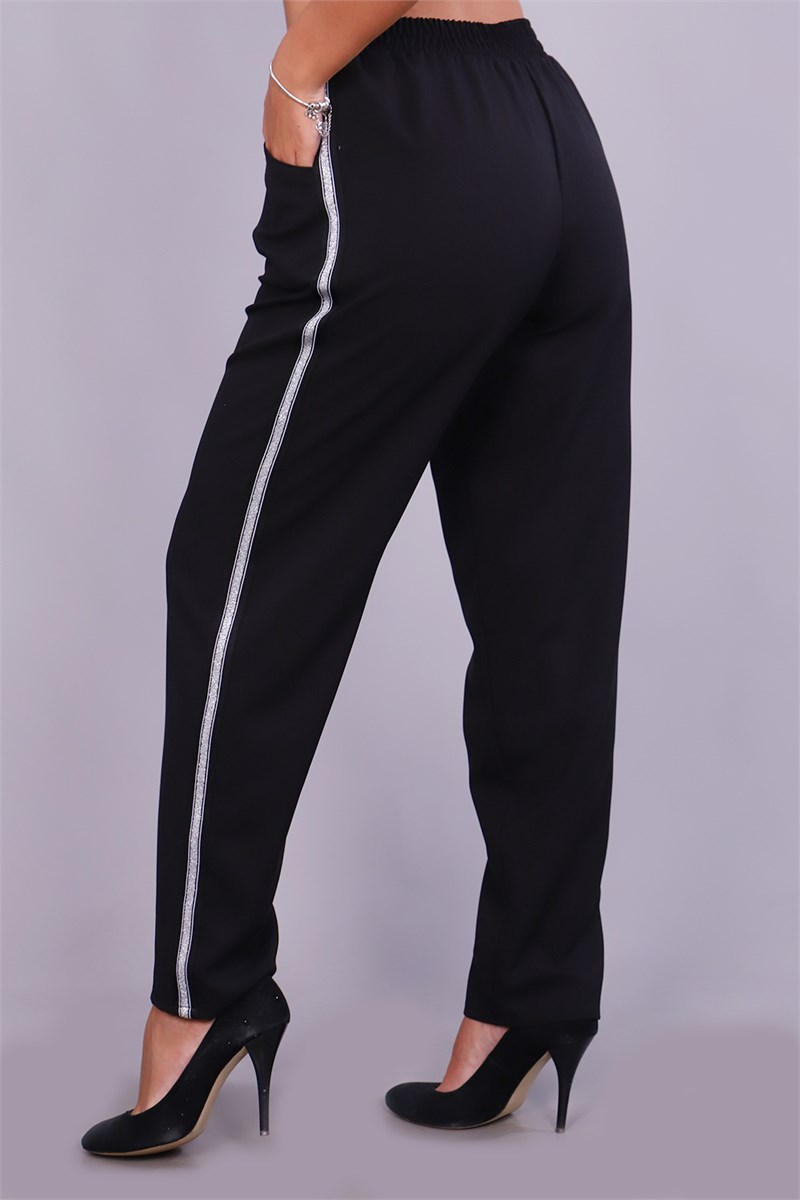 Удобные практичные классические черные брюки. Подойдут и для работы, и для торжественных случаев. Нарядность им придает лампас с серебряной люрексовой полосой. Ткань с содержанием льна не электризуется, приятна и комфортна к телу. Удобный пояс на широкой резинке, по бокам внутренние карманы. Будут хорошо смотреться с туфлями на каблуках и со спортивной обувью.