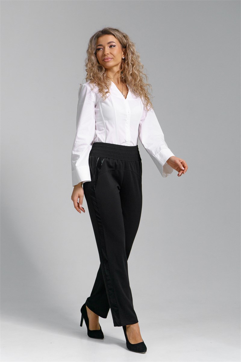 Женские стильные прямые брюки выполнены из двух видов материала: качественная эко-кожа и воздухопроницаемый плотный стрейч - трикотаж нейлон - рома. Два этих дополняющих друг друга материала создают комфорт, удобство и поддерживают температуру тела постоянной вне зависимости от условий внешней среды. Качественный материал не теряет свойств при интенсивной эксплуатации. Хорошо сохраняет первоначальную форму и презентабельный внешний вид. Неприхотливый, элементарно стирается, быстро сохнет, не нуждается в глажке. Модель такого плана поможет Вам создать сногсшибательный образ. Изделие выполнено на широком поясе - резинке с завышенной линией талии, что делает Вашу фигуру стройной и подтянутой. По бокам изделия имеется вставка и карман-обманка из экокожи, актуальной в этом и следующем сезоне. Брюки такого плана станут прекрасной основой любого образа, как на каждый день, так и на праздник. А размерная сетка не оставит без внимания прекрасных представительниц корпулентных форм, поэтому размерный ряд включает в себя большие размеры. Классические брюки с резинкой на поясе прекрасно подойдут как для повседневного образа на работу, в офис, так и на любое мероприятие. Брюки больших размеров вытягивают силуэт, делая ноги зрительно стройнее и длиннее, при этом надежно скрывая любые несовершенства. Легкие и комфортные, представлены стандартных и больших размеров плюс сайз plus size. Брюки с зауженными к низу штанинами позволяют создавать модные образы, а завышенная линия талии обеспечивает комфортную посадку. Универсальные, идеально садятся, не сползают и правильно ведут себя при движении. Из-за особенностей кроя визуально вытягивают силуэт и делают его тонким и изящным. Отличный вариант создать стильный образ для прогулок. Очень комфортные в повседневной носке в любой сезон. Если вы ищете брюки на каждый день, то эта удобная и практичная модель для Вас!