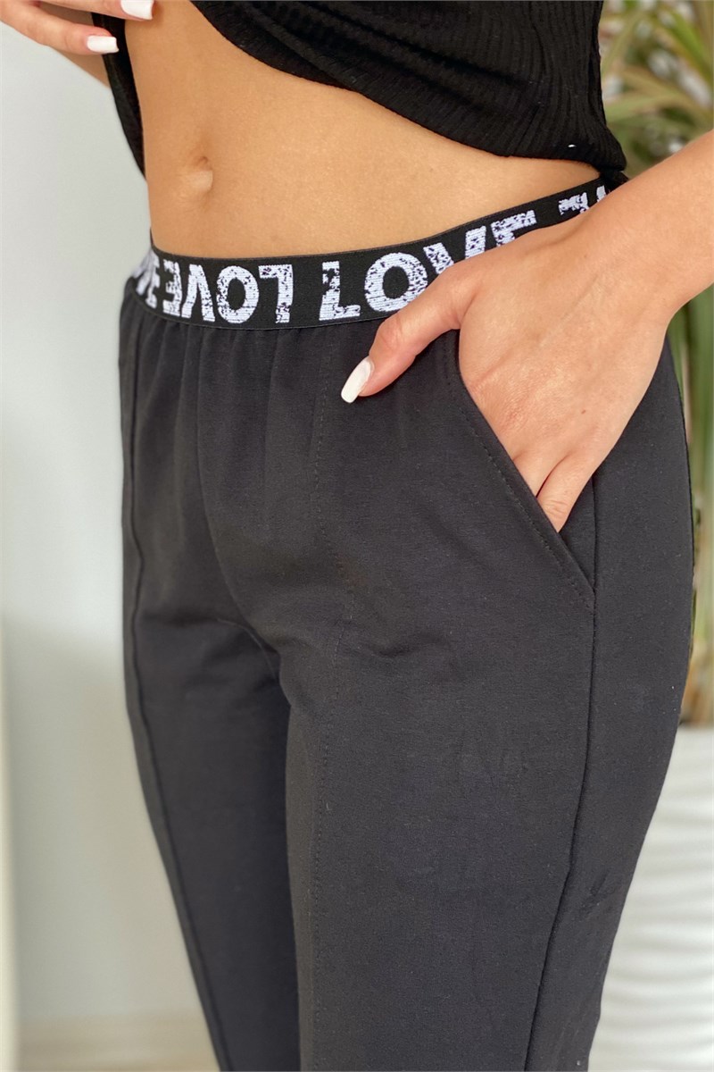 Брюки полуприлегающие, длиной 7/8, с карманами. Верх брюк обработан декоративной резинкой с надписью. Низ брюк фигурный.