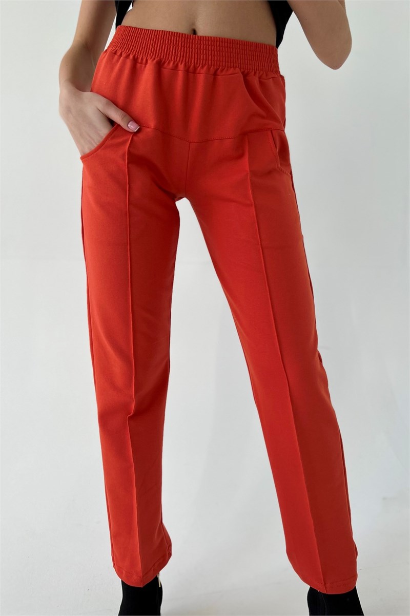 Брюки на поясе, с боковыми карманами, на кокетке. Вдоль передних половинок расположены стрелки.