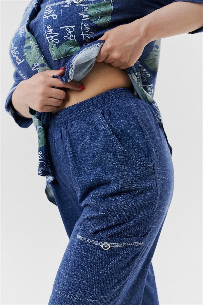 Брюки женские, бананы. На передней части брюк внутренние карманы. Также имеются два накладных кармана с пуговицей, Один в верхней части брюк, другой на средней части брюк. Низ передней половинки брюк на резинке. Пояс прострочен на многоигольной машине.