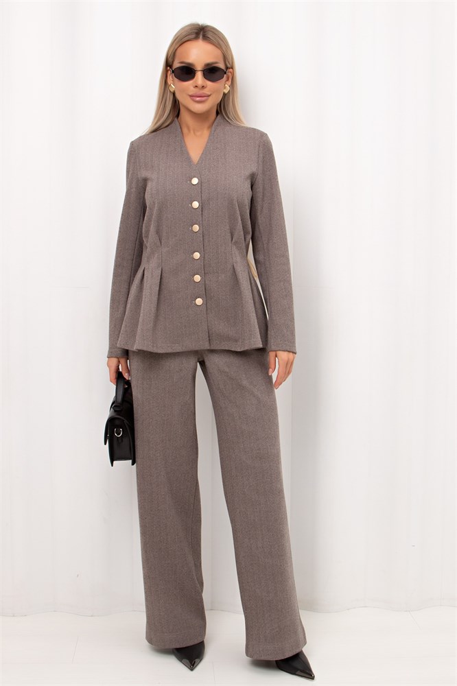 Практичные брюки свободного кроя из утепленного костюмного трикотажа в «ёлочку». Модель имеет функциональные карманы в боковых швах. Комфортную посадку на талии обеспечивает притачной пояс с эластичной резинкой на спинке. Модель без застежки.