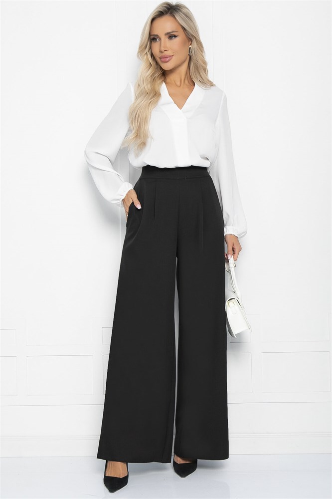 Роскошные брюки палаццо прекрасно подойдут для стильного делового образа. Классический чёрный цвет позволяет комбинировать их с разнообразным по цвету верхом. Такие брюки отлично подходят на любой случай - на учебу, работу и даже на торжественное мероприятие! Карманы есть в боковых швах. По талии притачной пояс, по спинке резинка.