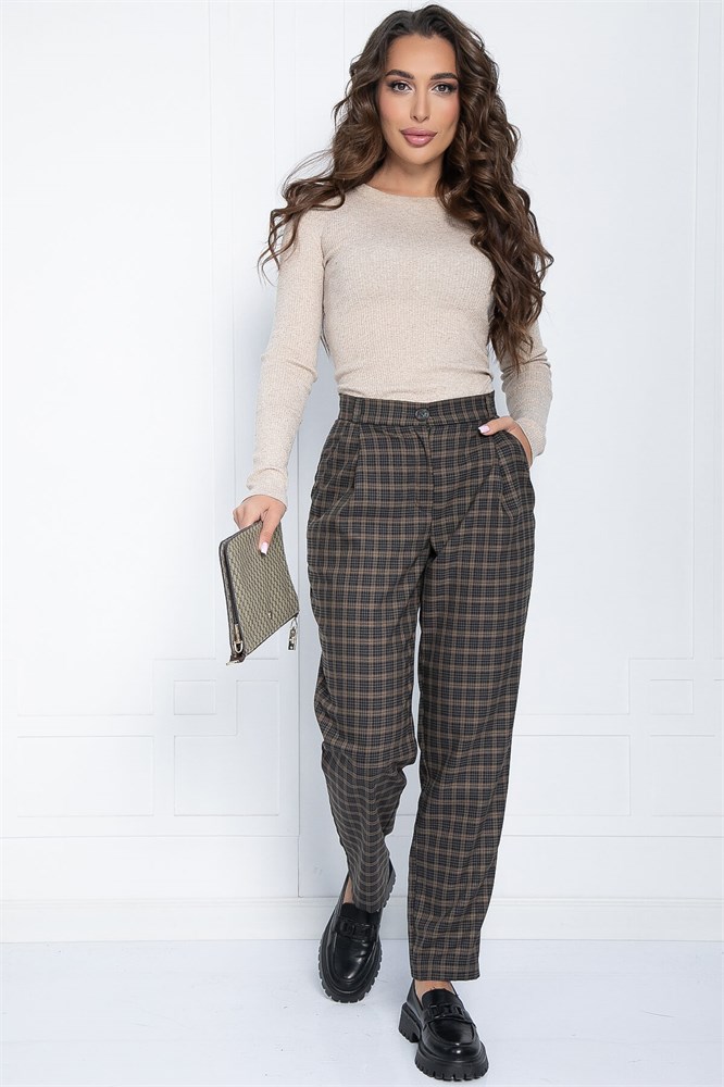Прямые классические брюки в клетку — отличный выбор для офиса, прогулок и повседневной носки. Они прекрасно сочетаются с однотонным верхом. Брюки имеют пояс со шлёвками (петлями для ремня). Силуэт брюк полуприлегающий, к низу они заужены. В боковых швах расположены карманы.
