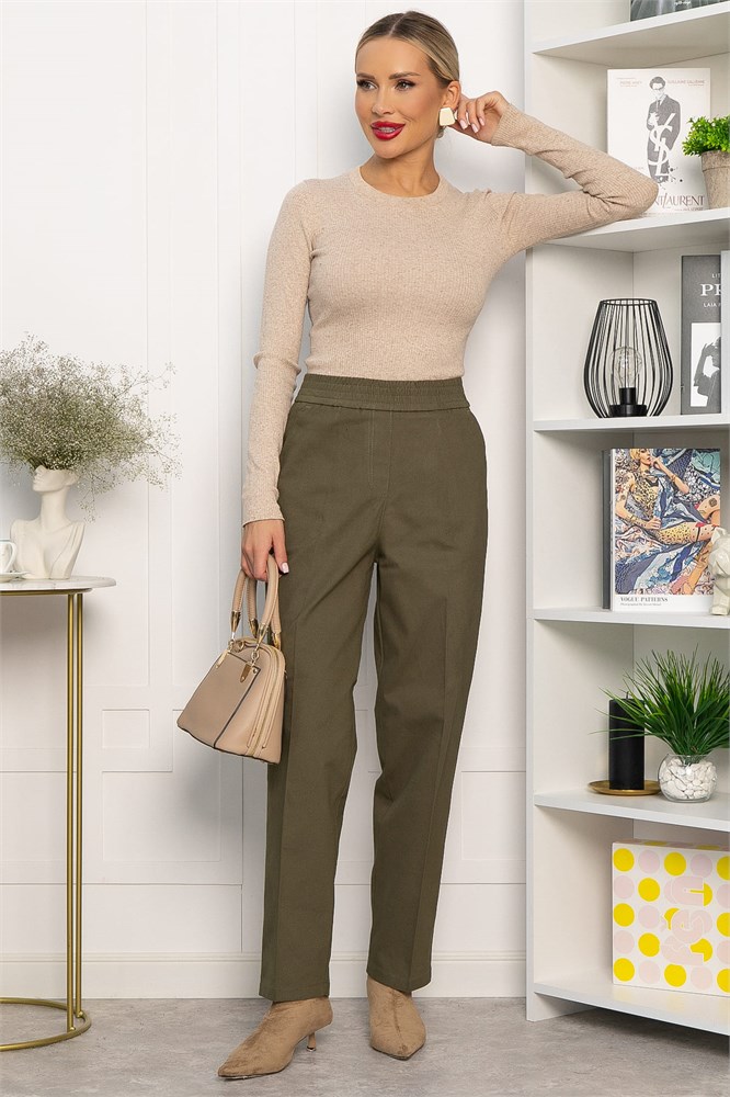 Стильные и удобные брюки цвета хаки — идеальный выбор для любого случая. Выполнены из натурального материала, который обеспечивает комфорт. По талии на резинке. По бокам практичные карманы, спереди имитация застёжки. Эти брюки станут основой вашего повседневного образа, сочетая стиль и удобство.