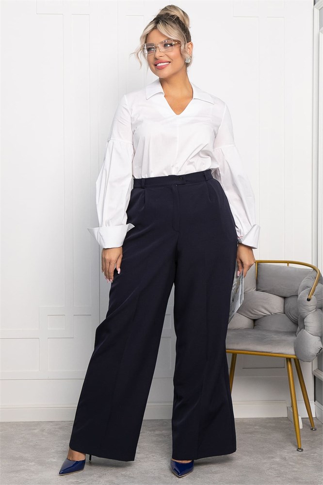 Комфортные классические брюки прямого силуэта. Свободный крой и притачной пояс с эластичной резиной по спинке обеспечивают безупречную посадку. Брюки оснащены молнией и пуговицей спереди, а также заложенными складками спереди и сзади. Высокая талия создает красивый силуэт, а карманы добавляют практичности. Низ изделия с широким подгибом.