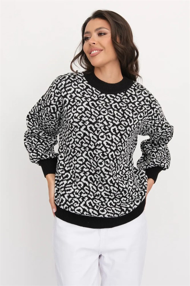 Женский вязаный джемпер свободного силуэта. Плечо спущенное, рукава втачные длинные. Горловина круглая обработанная эластичным переплетением. Джемпер выполнен жаккардовым переплетением, образующим анималистический принт "леопард". Горловина, манжеты и низ изделия выполнены эластичным переплетением.