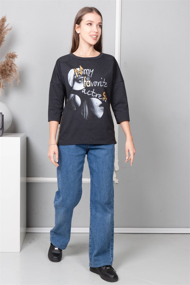 Джемпер из футера с лайкрой, круглая горловина обработана обтачкой, спущенная пройма, рукав 3/4. На спинке кокетка, низ спинки слегка удлинён и закруглён. Стильный принт и лампасы по боковым швам придают джемперу некую изюминку. Тёплый, комфортный джемпер для девушек любой фигуры и возраста