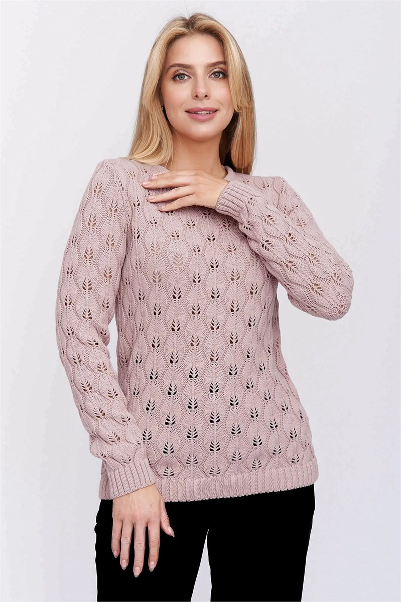 Полушерстяной джемпер с круглой горловиной. Рукава втачные длинные с эластичной манжетой. Ажурная вязка.