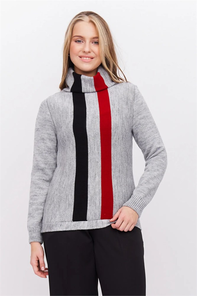 Женский вязаный джемпер прямого силуэта. Воротник-стойка.Рукава втачные полной длины. Две яркие вертикальные полосы визуаьно удлиняют и стройнят силуэт.