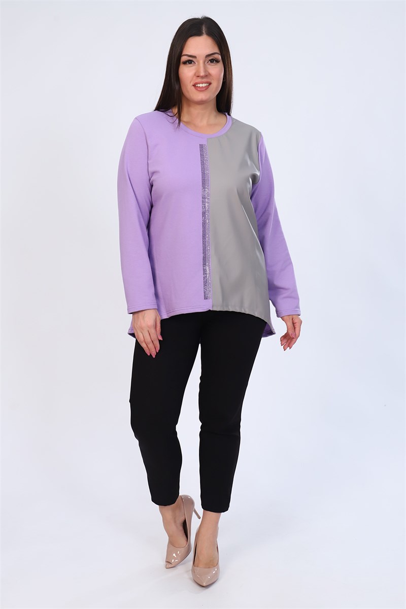 Женский джемпер. Данная модель уникальна. Задняя часть модели удлинена, перёд разделён на две части, между которыми находится полоса из страз. Одна из частей состоит из эко-кожи серого цвета. Джемпер оверсайз, подойдёт всем!