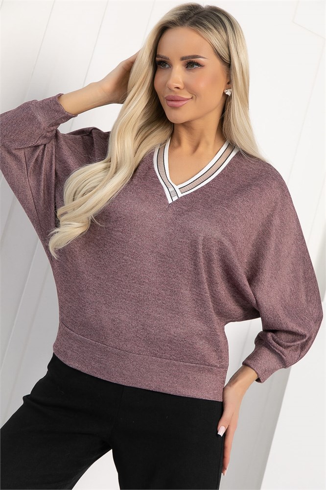 Трикотажный джемпер свободного силуэта с V-образной горловиной — идеальное сочетание комфорта и шика! В отличие от спортивных толстовок позволяет создавать теплые женственные комплекты на каждый день. Рукав-реглан не придает дополнительного объёма в плечах.