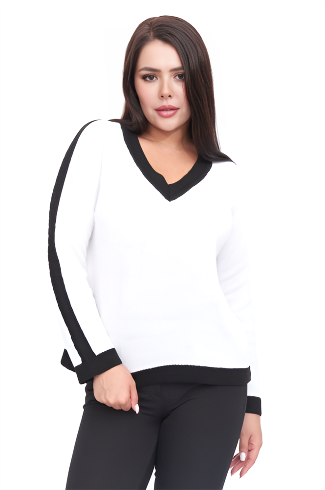 Женский джемпер с V-образным вырезом горловины в спортивном стиле. Рукав-реглан полной длины. По низу изделия и рукава эластичная резинка. Контрастная отделка. Отлично сочетается как с классическими брюками, так и с джинсами, и юбками.
