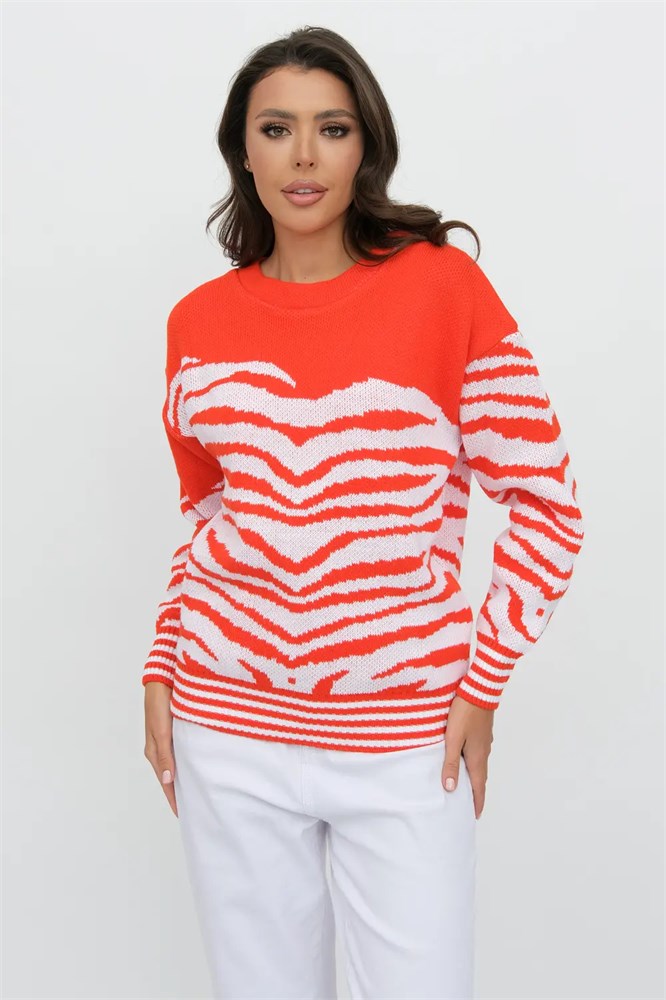 Современный женский джемпер свободного силуэта с круглой горловиной. Спущенное плечо,рукав полной длины. Джемпер выполнен жаккардовым переплетением с абстрактным рисунком. Низ изделия и низ рукавов с эластичным переплетением.