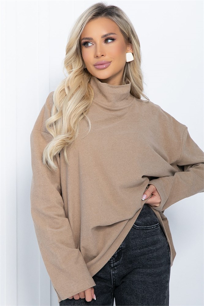 Удлиненный джемпер с воротником-стойкой — это идеальное сочетание удобства. Он имеет длинный рукав и асимметричный свободный крой, что делает его незаменимым в холодное время года. Бежевый оттенок этого джемпера подходит к любому образу. А благодаря свободному крою он будет особенно хорош для будущих мам.