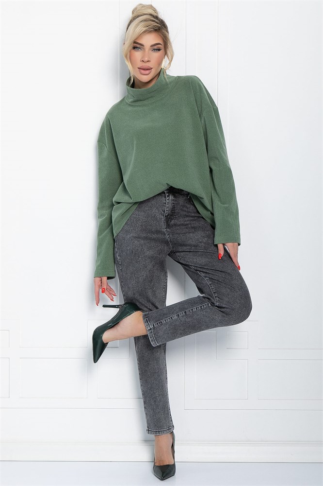 Удлиненный джемпер с воротником-стойкой — это идеальное сочетание удобства. Он имеет длинный рукав и асимметричный свободный крой, что делает его незаменимым в холодное время года. Благодаря свободному крою он будет особенно хорош для будущих мам.