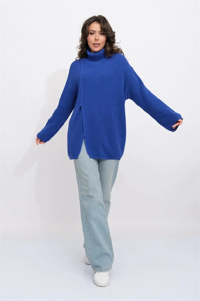 Джемпер оверсайз с воротом-стойкой. Рукава длинные со спущенным плечом. По переднему полотну изделия сбоку стильный глубокий разрез.