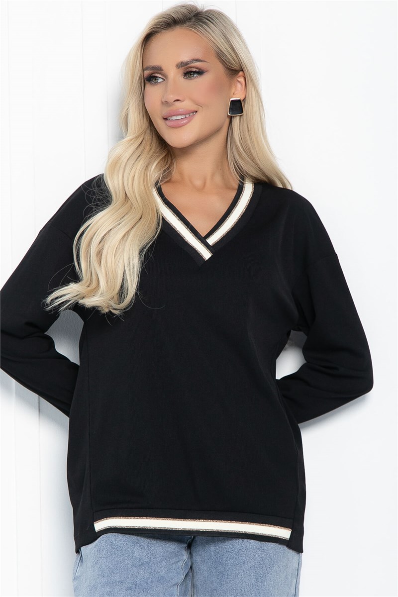 Очаровательный джемпер привнесет нотку шарма и легкости в ваш гардероб! Его уникальная особенность — привлекательный V-образный вырез, украшенный люрексной нитью. Низ изделия декорирован такой же вставкой, как на горловине, которая придает образу спортивный стиль. Джемпер имеет длинный втачной рукав. Такой джемпер отлично будет смотреться как с джинсами, так и с брюками.