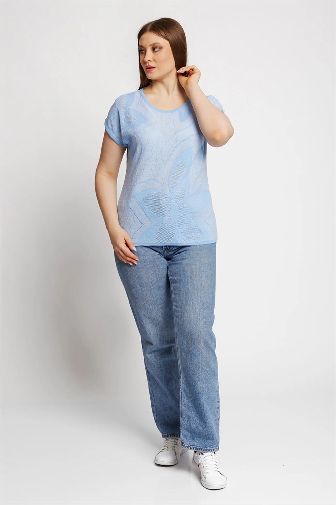 Удобный и стильный женский джемпер, с незатейлевым рисунком-цветами. Свободный, не приталенный крой, скрывающий недостатки фигуры. Открытая круглая горловина.