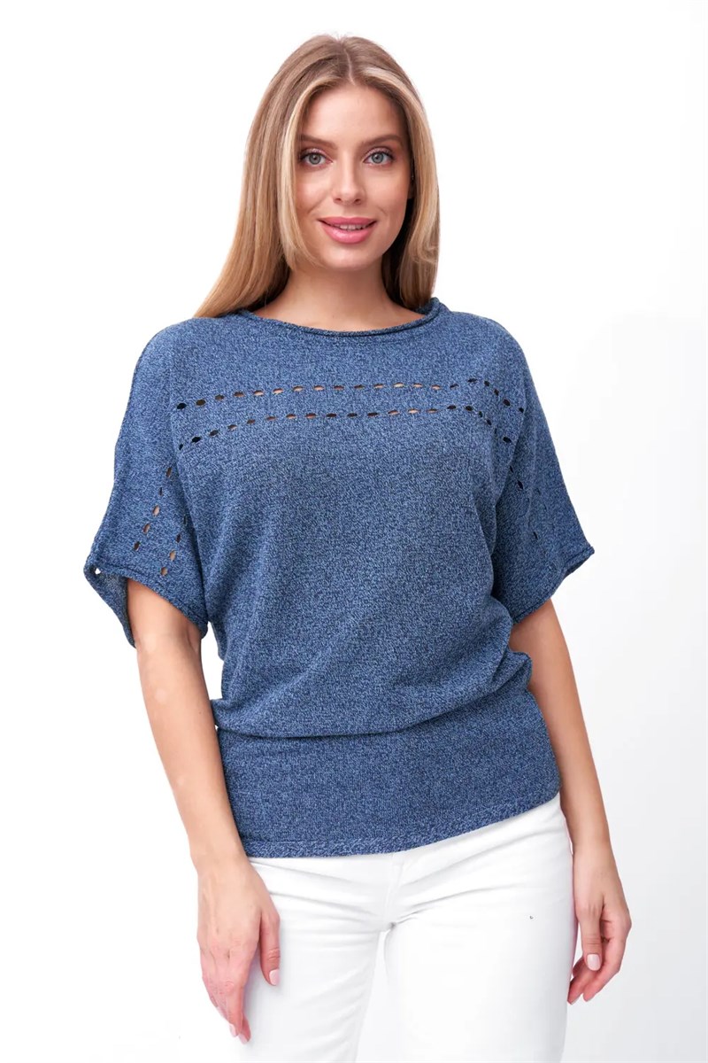 Джемпер с цельновывязанным рукавом "летучая мышь"длиной до локтевого сгиба. Горловина круглая лодочка. Джемпер выполнен структурным кулирным переплетением. По линии выше груди проходит ажур.