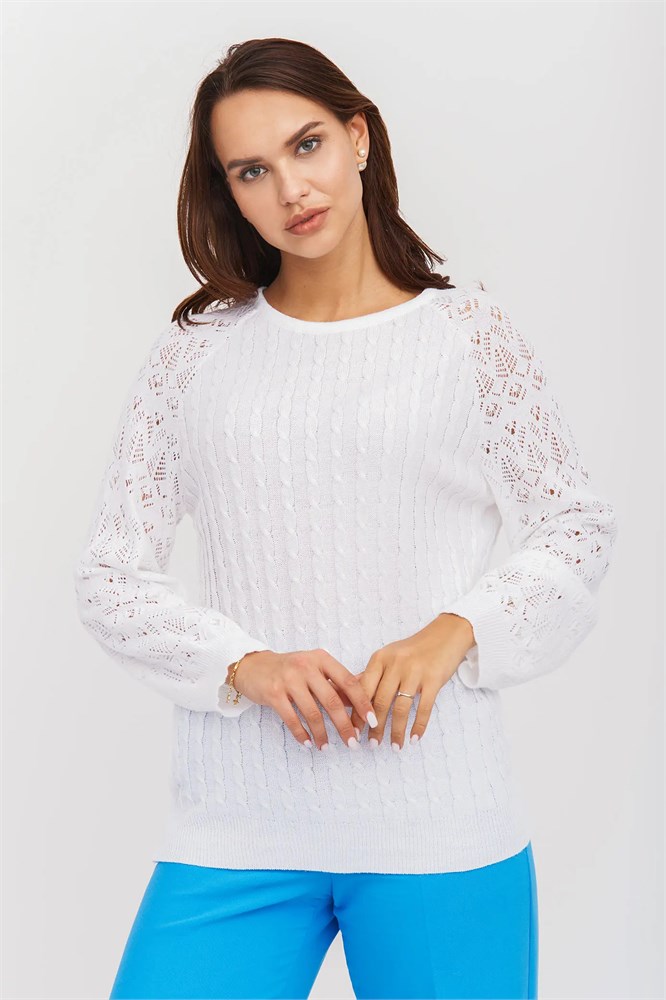 Джемпер женский трикотажный свободного силуэта. Рукава реглан, вырез горловины круглый. Джемпер выполнен выполнен переплетением образующим вертикально расположенные косы, рукава выполнены ажуром, низ изделия и манжеты выполнены эластичным переплетением.