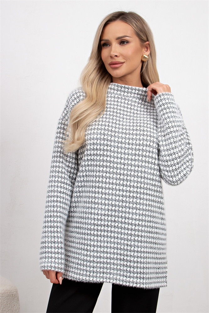 Джемпер из теплого трикотажного полотна свободного кроя. Длинный рукав со спущенным плечом. Воротник стойка. Низ ровный, имеются разрезы в боковых швах.