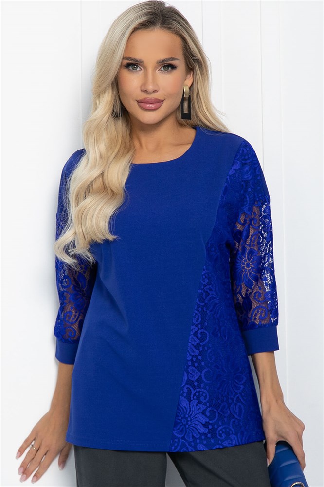 В вашем гардеробе прекрасно будет смотреться трикотажный джемпер свободного кроя в синем цвете. Простой и лаконичный силуэт этой модели отлично сочетается с любой базовой одеждой. Свободный крой деликатно скрывает недостатки фигуры. Джемпер имеет втачной рукав со спущенной линией плеча и длину 3/4. Контрастный акцент в изделии создают кружевные вставки.