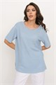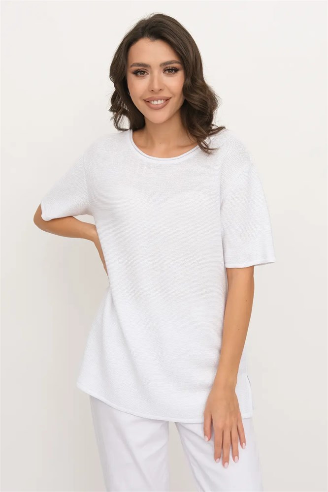Женский трикотажный джемпер свободного силуэта. Рукав втачной короткий, вырез горловины круглый. Джемпер выполнен структурным кулирным переплетением.