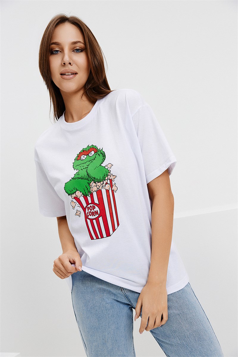 Свободная футболка из 100% хлопка. Горловина обработана планкой из эластичной рибаны с лайкрой. Удобный крой, яркая печать с позитивным Оскаром - любителем поп-корна поднимет настроение. Изделие отлично подойдет для повседневного использования, для занятий спортом и прогулок. А если вы любите одежду в стиле оверсайз, то можно выбрать на 1-2 размера побольше.