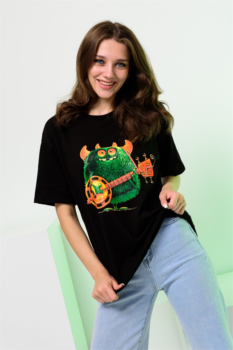 Женская молодёжная футболка с коротким рукавом и округлой горловиной. Комфортный крой не сковывает движений, горловина обработана планкой из эластичной рибаны и имеет отстрочку, что придаёт изделию аккуратный вид. Оригинальная печать с чудоковатым персонажем, играющим на банджо, создаст позитивный настрой. Изделия из стопроцентного хлопка комфортны в использовании, гипоаллергенны и гигроскопичны, отлично подойдут для повседневного использования, занятиями спортом, для отдыха и прогулок.