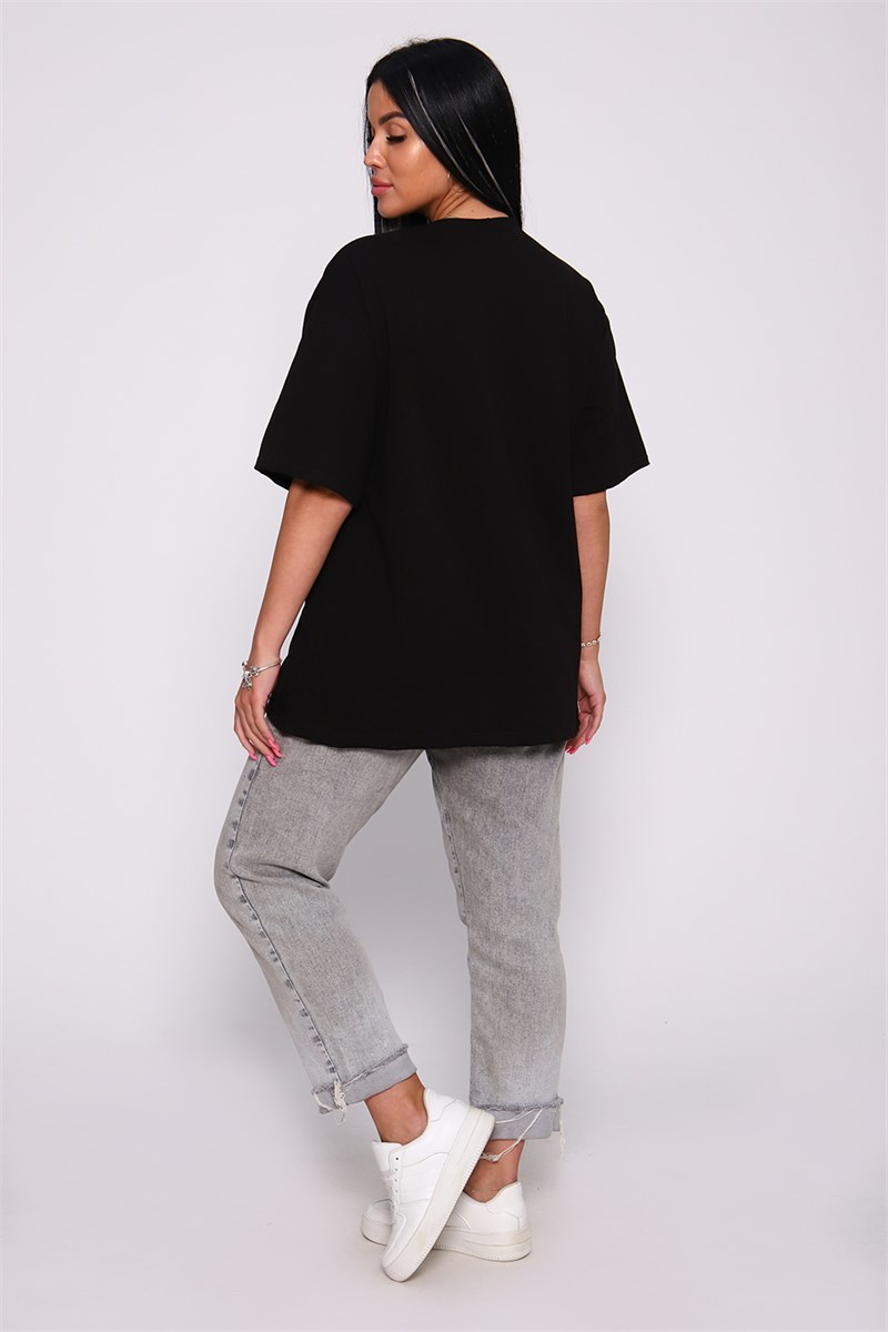 Футболка прямого силуэта со спущенным рукавом до линии локтя. Вырез горловины круглый, обработан рибаной.