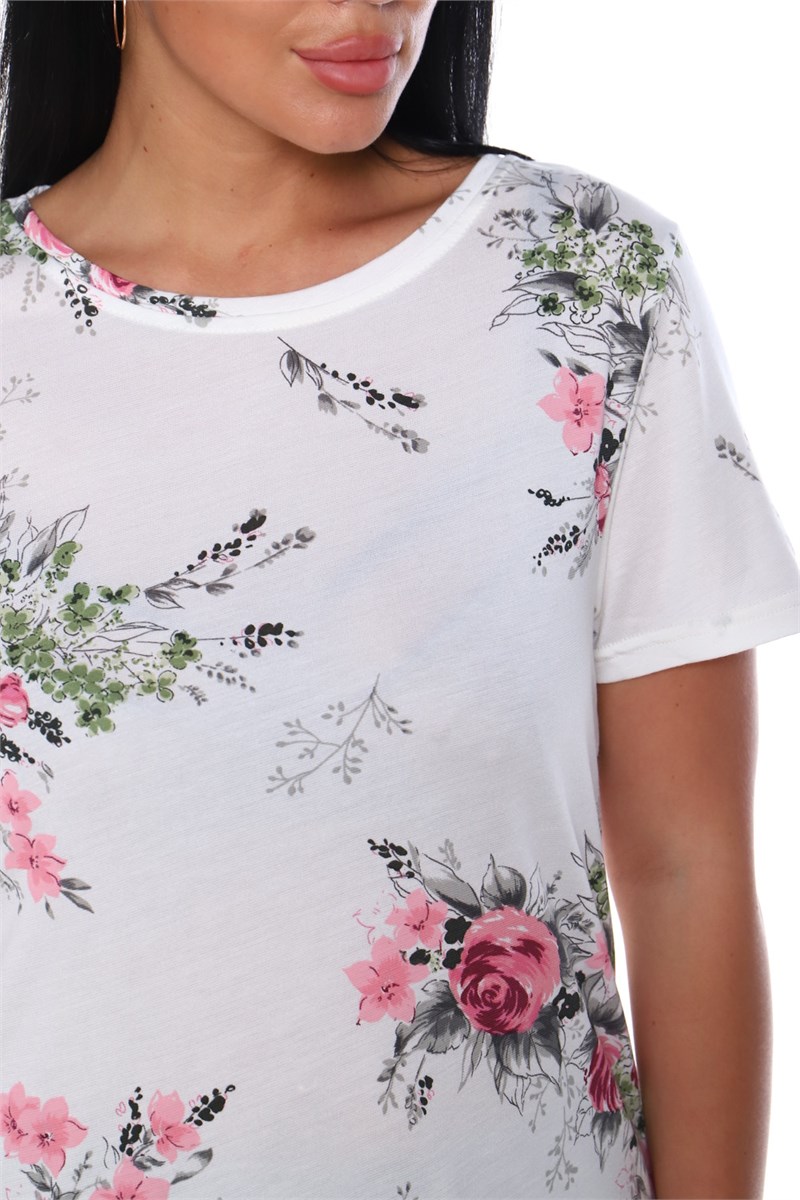 Футболка женская с цветочным принтом из набивного вискозного полотна с добавлением лайкры. Полуприлигающий силуэт, круглый вырез горловины, короткий рукав. Подходит для ежедневного гардероба, может сочетаться с брюками, джинсами и юбками.