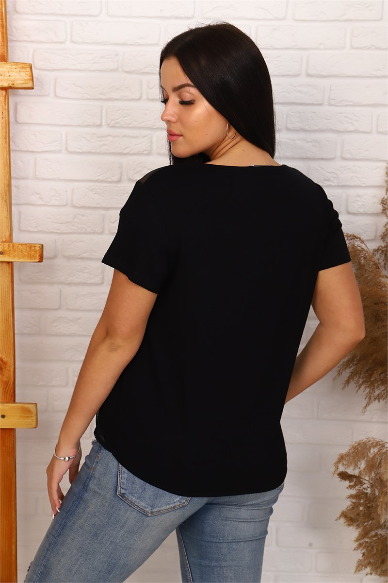 Женская футболка полуприлегающего силуэта выполнена из приятной к телу вискозы и пользующейся большой популярностью сетки. На центральную деталь полочки наложена печать в виде серебристой надписи, что делает футболку ещё более привлекательной. По мнению модных специалистов вещи с сеткой должны стать must - have в гардеробе каждой женщины.
