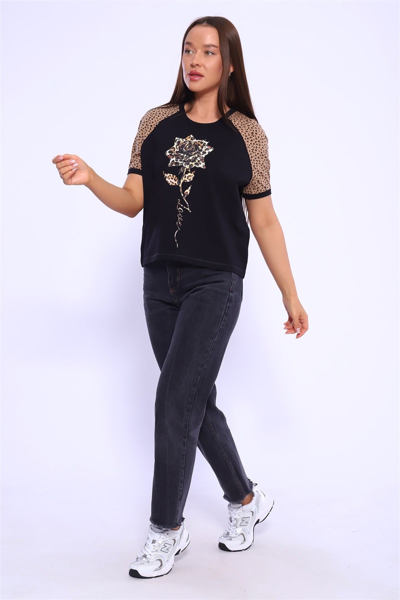 Элегантная классная футболка с принтом леопардовой розы, стильная, красивая, а главное удобная и комфортная. Футболка выполнена из хлопка с добавлением лайкры. Идеально подойдет в качестве базового элемента одежды для дома, в офис, для спорта и для повседневной носки. Легко будет сочетаться с любой вещью в вашем гардеробе. Идеальный выбор для модных женщин, которые ищут базовую одежду для лета. Подойдет для создания ярких и стильных образов.