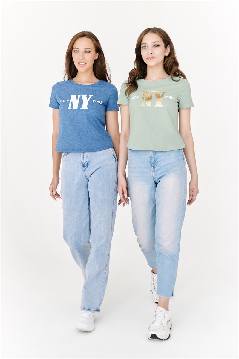 Футболка прямого силуэта, с фигурной линией низа, с округлой горловиной. Рукав втачной, короткий. Горловина обработана обтачкой из основного полотна. На полочке эффектно сочетаются аппликация из пайеток в виде букв NY и печать New York