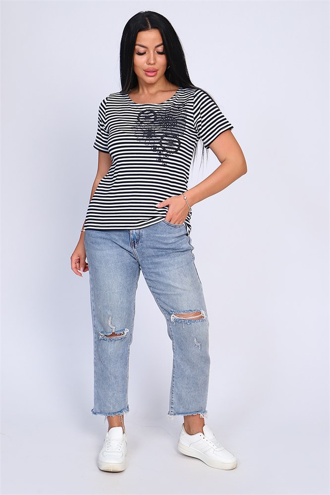 Стильная женская футболка из вискозы в полоску - настоящая находка для модниц, любящих комфорт и красивый вид. Модель с круглым вырезом горловины и коротким рукавом , слегка приталенного силуэта красиво подчеркнет изгибы фигуры и сделает вас женственной в любом наряде: в дерзком молодежном или сдержанном классическом. Футболку украшает изящный рисунок-цветок, что делает ее неповторимой и оригинальной. Универасальная модель женской футболки на каждый день способна стать частью офисного, нарядного, вечернего и повседневного образа.